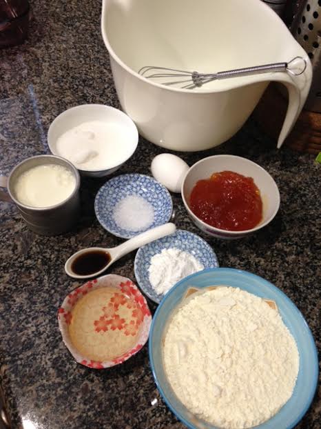 Once the flour is fully whisked in, you’re left with a batter that is smooth and flows easily, but thick enough to hold up fruit preserves. This is when you add that in, folding it into the batter until just incorporated.