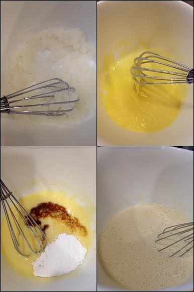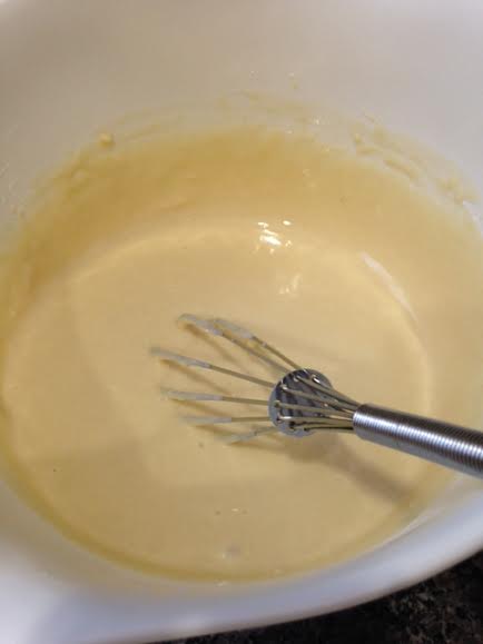 - Whisk in milk, making sure to dissolve the sugar mixture completely. At this point, the batter will be very runny and bubbles will have formed. Wait a few moments for the bubbles to lessen.